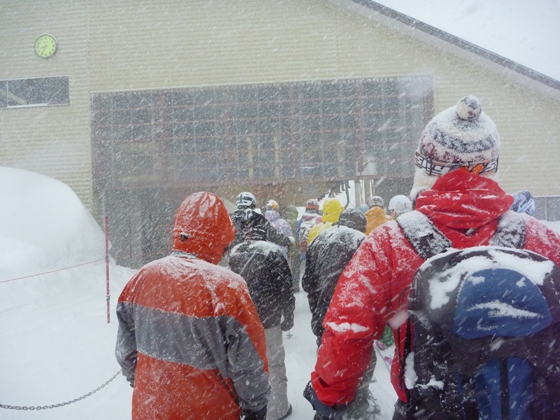 「お客様にお願い申し上げます。現在、スキー場までの幹線道路除雪のため通行止めとなっております。除雪終了は2時を予定しております。ご迷惑をおかけいたしますが、お帰りのお客様におかれましては、スキー場で待機をお願いいたします」能生ICからシャルマン火打までの道は一本道。