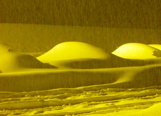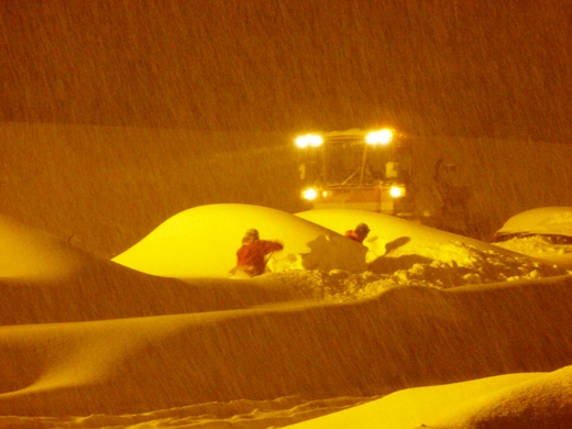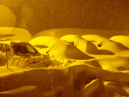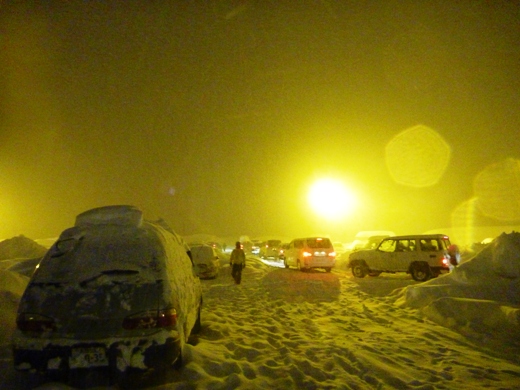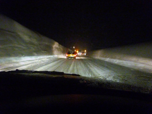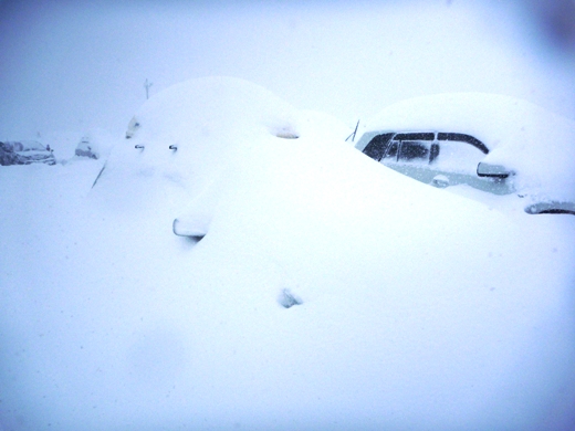 4時ころ、通行止め解除の放送が入り、少し待って車に戻ると、すでに10cmほど雪をかぶっていた。
