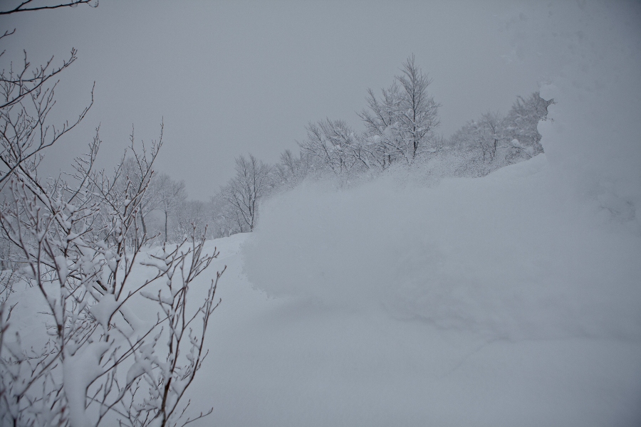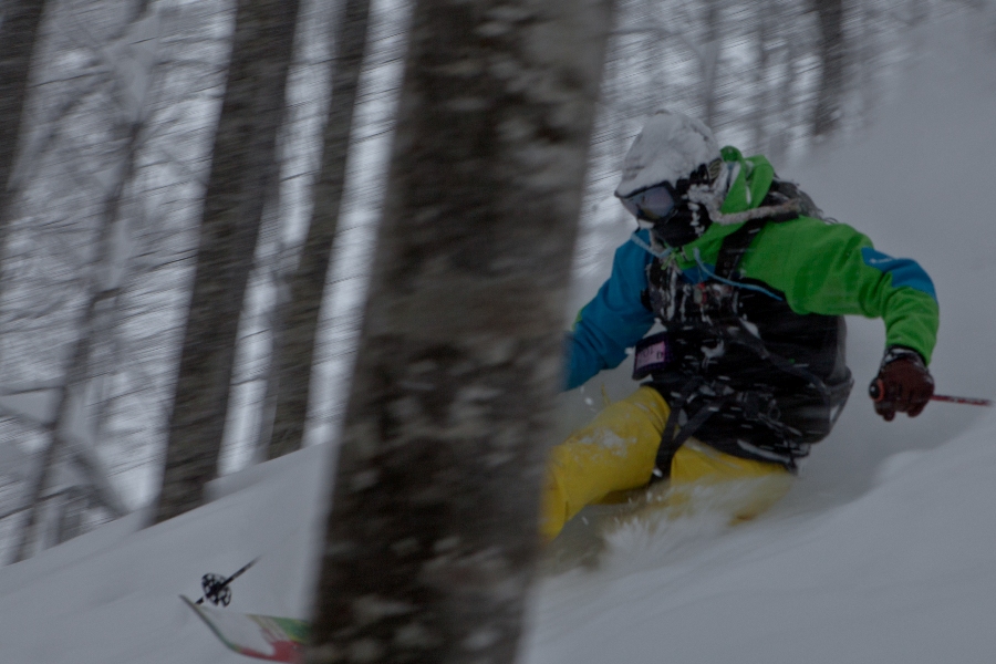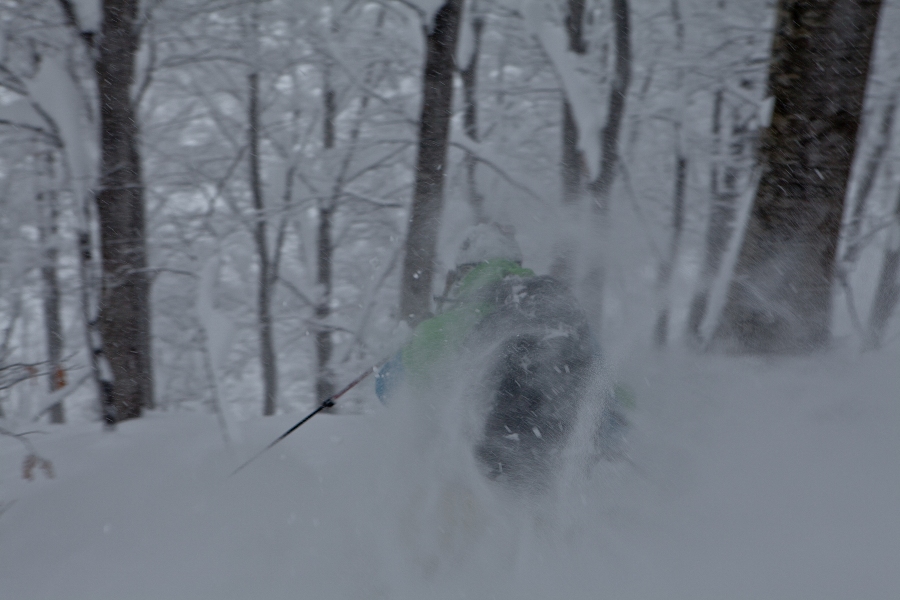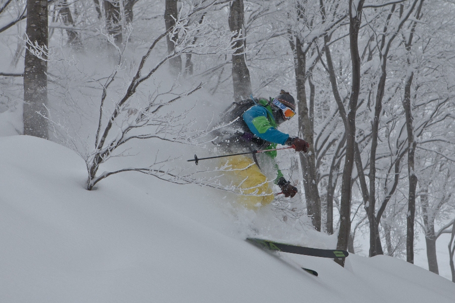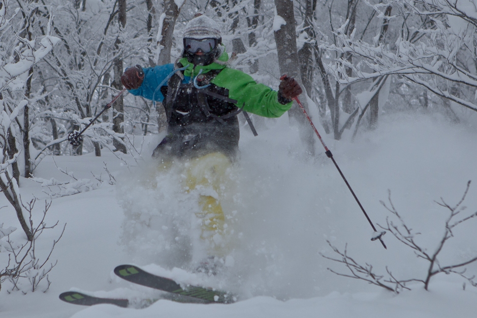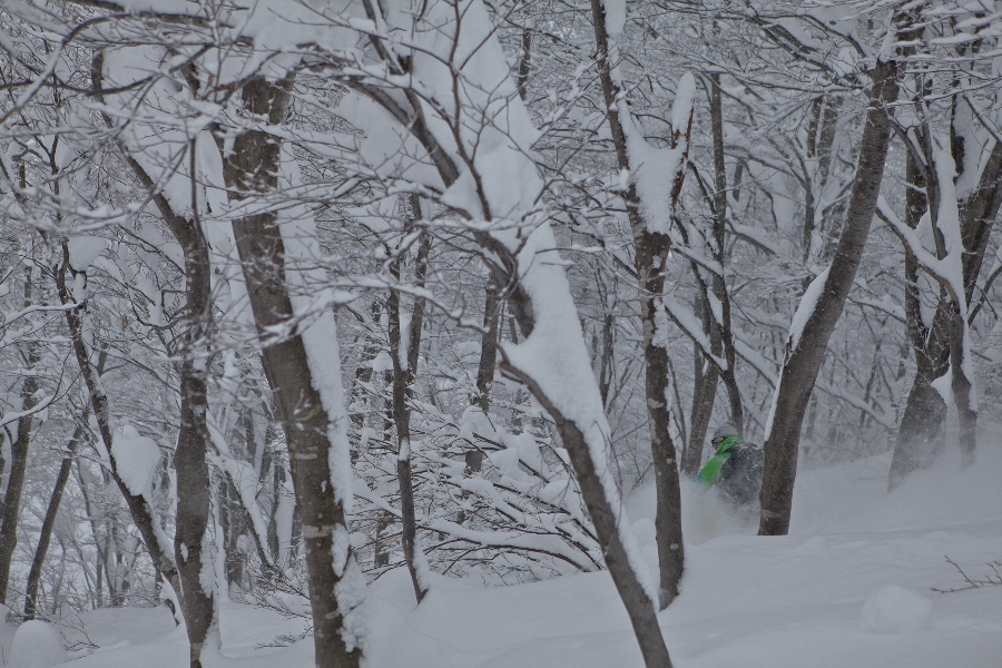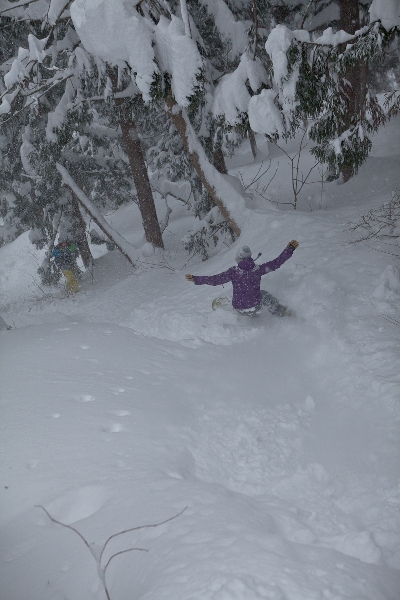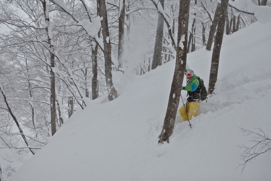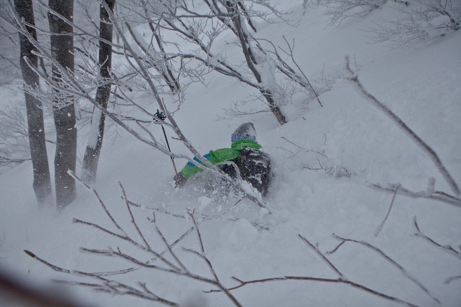 滑る雪はパウダー。斜面は藪がち(笑)