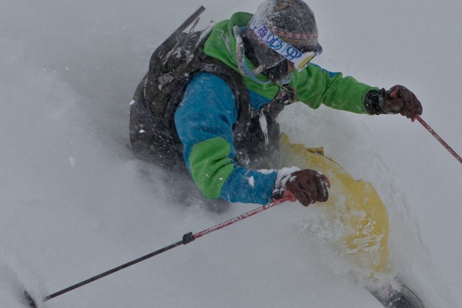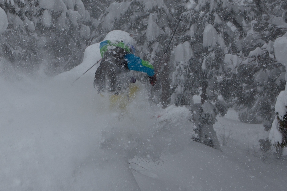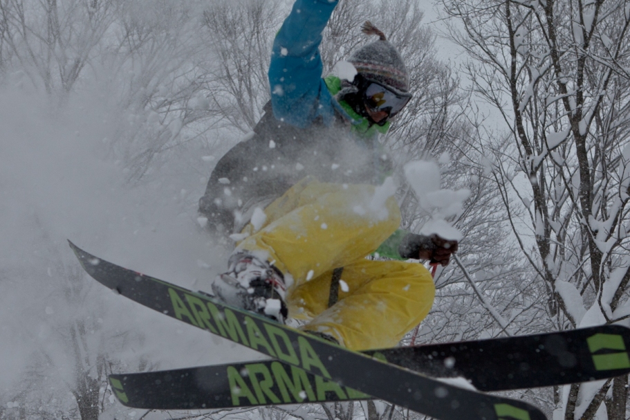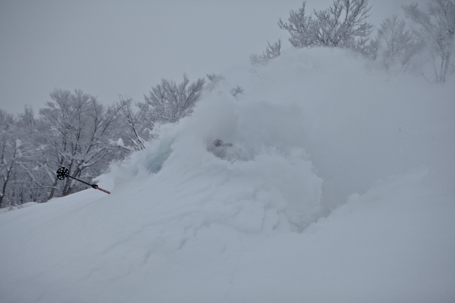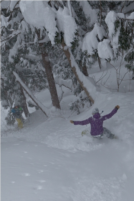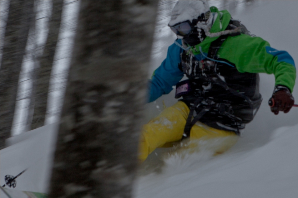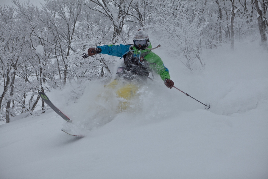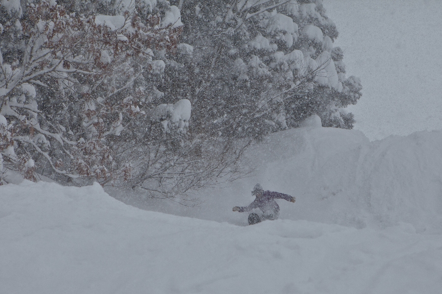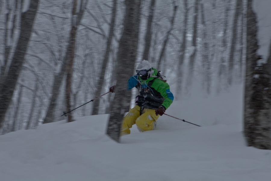 滑る雪はパウダー。斜面は藪がち(笑)