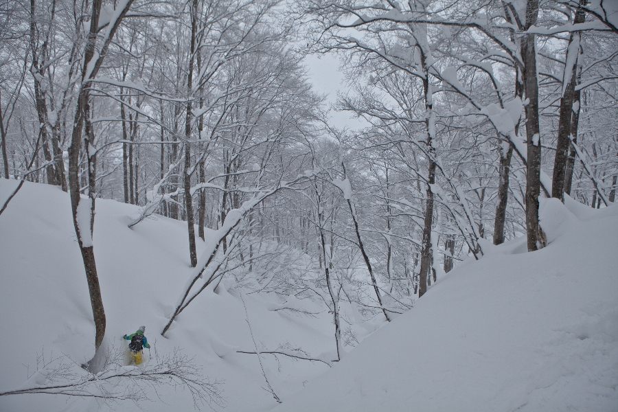 滑る雪はパウダー。斜面は藪がち(笑)